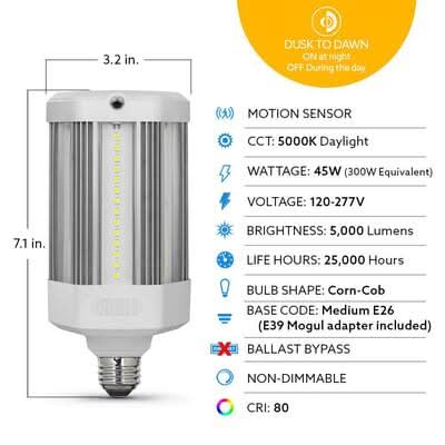 Feit Electric 300W Equivalent Corn Cob E26/E39 Motion & Dusk To Dawn High Lumen Hid Utility Led Light Bulb Daylight 5000K (1-Pack)