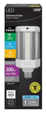 This C5000/5KDDMM/LEDHDRP dual function corn cob-shaped LED light bulb from Feit Electric provides maximum illumination for large rooms, barns or anywhere you need more light. You have the option to set Dusk to Dawn or Motion Detection mode. for Dusk to Dawn mode, light bulb will activate at dusk and off at dawn thanks to a built-in photo cell sensor, which adds to overall energy savings. Switching over to Motion Detection mode, automatic sensors turn the light on when motion is detected from up to 19 ft. away. Great for outdoor use as a preventative measure against trespassers or indoor as a handy hands-free way to light up a space as you walk by. LED technology puts out and ultrabright 5000 Lumens using just 45-Watt - up to 85% better than equivalent 300-Watt incandescent. These bulbs have an average life of 25000 hours/22.8 years, are ROHS compliant and 100% Mercury-free.