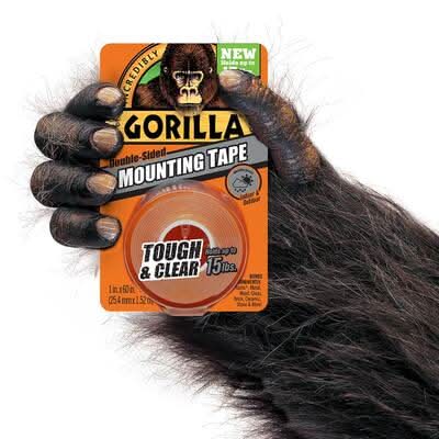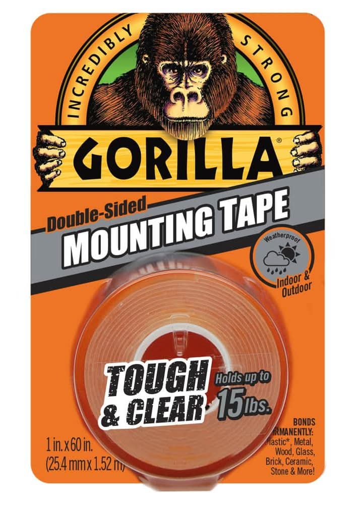 Gorilla Tough and Clear Mounting Tape is a clear double-sided tape that mounts in an instant, for a permanent, weatherproof bond. The crystal clear adhesive tape wont yellow over time, and holds up to 15 lbs. Gorilla Tough and Clear Mounting Tape is perfect for indoor and outdoor projects and sticks to smooth and rough surfaces. Completing DIY projects is easy with this tough, double sided tape. Mount, build, and repair. • Size: 1x60 in • The Gorilla Glue Company, 2101 E. Kemper Road,Cincinnati,OH,45241