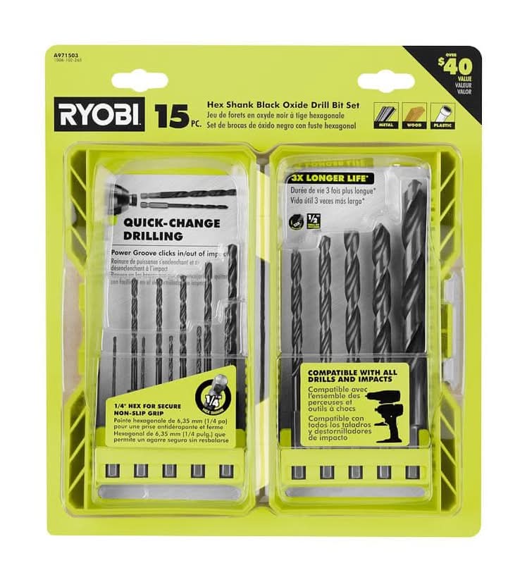 RYOBI introduces the 15-Piece Black Oxide Hex Shank Drill Bit Set. This assortment of drilling bits are perfect for a variety of materials including wood, metal, and plastic surfaces. The bits are constructed out of high speed steel with a black oxide finish to offer superior durability and 3X longer life. Another feature of these bits is the 135° split point to drill on contact and prevent your bit from walking. The 1/4 in. hex design provides secure Cancer and Reproductive Harm - www.p65warnings.ca.gov • Color: Black • Size: 0.25 in