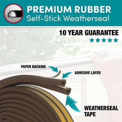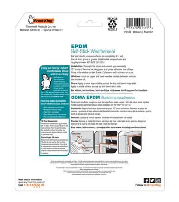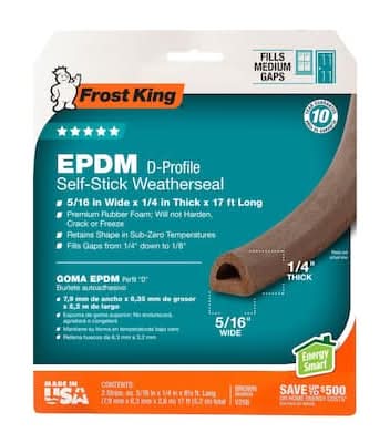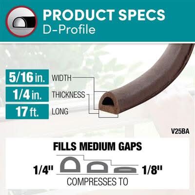 The Frost King V25BA 5/16 in. x 1/4 in. x 17 ft. Brown D-Center Medium Gap Premium Rubber Weatherseal Tape is a multi-purposed product that can be used for a wide range of indoor and outdoor uses, providing a versatile self-stick tape with medium compression that creates tight seals for energy savings. It will not harden, crack, or freeze at temperatures as cold as -40°. It is a high compression product which will spring back to shape even after long e Cancer and Reproductive Harm - www.P65Warnings.ca.gov • Color: Brown • Size: 5/16 In X 1/4 In X 17 Ft