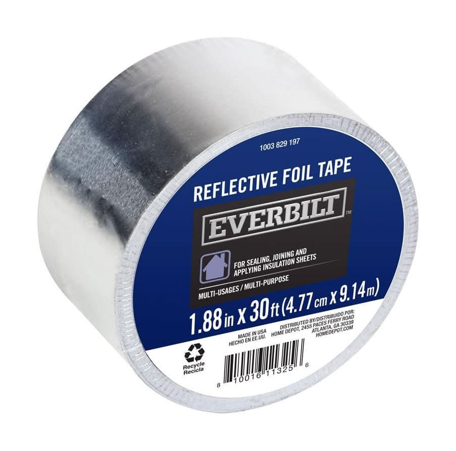 Everbilt Foil Tape helps keep your property warmer in winter and cooler in summer. Everbilt tape holds the insulation together for tighter fit so there are no gaps or holes during installation. Everbilt Insulation reflects thermal rays retaining heat or alternatively keeping living spaces cool. Everbilt Insulation provides an insulating barrier between interior and exterior environments protecting against Cold, Heat and UV Light and can be used in floors, walls and roofs in a variety of structures including finished attics, basements, Interior and exterior walls, garden buildings, recreational vehicles and pet homes. Fiber and irritant free, it is lightweight and flexible for easy installation. • Color: Silver • Size: 1.88 In X 30 Ft • Packaging: Reusable