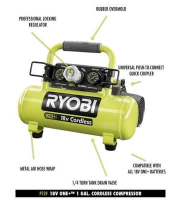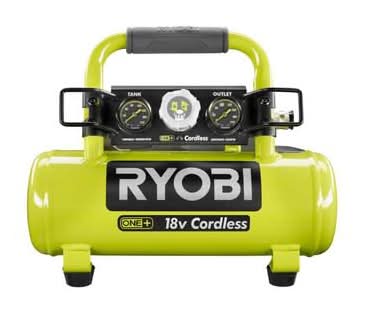 RYOBI introduces the 18V ONE+ Cordless 1 Gal. Portable Air Compressor (Tool Only). Performance meets portability with this addition to The System of over 300 Cordless Products that all work on the same battery platform. This cordless compressor delivers cordless air up to 120 PSI making it perfect for roadside tire inflation or for turning pneumatic finish nailers into cordless finish nailers. Best of all, it is part of the RYOBI ONE+ System of over 300 Cancer and Reproductive Harm - www.p65warnings.ca.gov