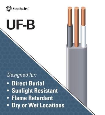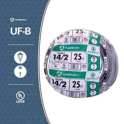 Southwire's copper UF-B cable is used in applications that include outside lamp posts, pumps and other loads. It can also be used for outbuildings such as garages and barns. UF-B feeds from a distribution point in an existing building. UF-B has a heat capacity of 90°C and is rated at 600-Volt. UL Listed and CSA Certified. • Color: Gray • Size: 25 ft