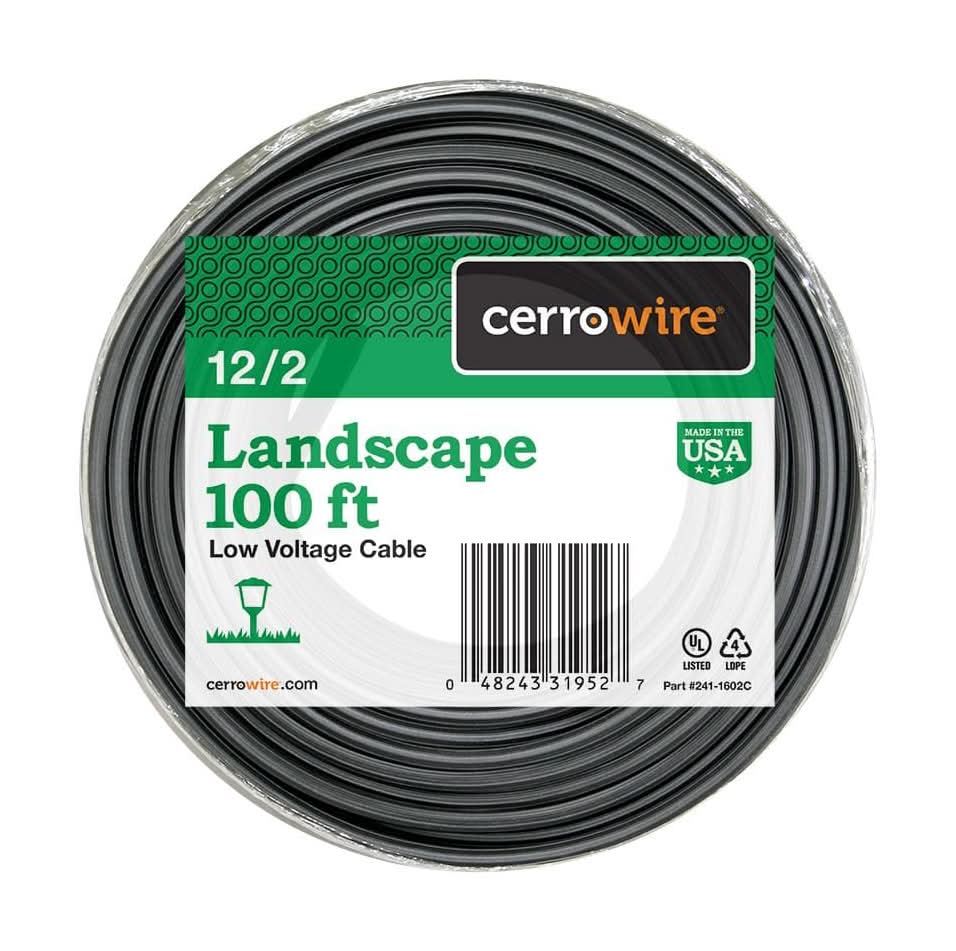 12-2-Gauge Low-Voltage (low-energy) underground landscape lighting cable is designed for landscape, security, and outdoor accent lighting applications not to exceed 150-Volt. Landscape Lighting Cable is sunlight-resistant, suitable for direct burial, and for use at temperatures between -20˚C and 60˚C. Jacket is made of PVC. • Color: Black • Size: 100 ft • Packaging: Reusable