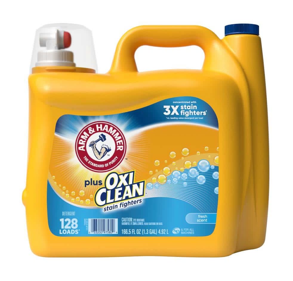 ARM & HAMMER Plus OxiClean Liquid Laundry Detergent is ideal in standard and High Efficiency (HE) washing machines. This low-sudsing, clean-rinsing fresh scent detergent delivers 5 powerful cleaning benefits in 1: it attacks stains, fights odors, whitens whites, brightens colors and delivers a boost of freshness. This laundry detergent powers out microscopic stains and dirt to deliver a hygienic clean. Concentrated with 3X powerful stain fighters in every load versus the leading value detergent, this HE detergent is powerful enough to handle your toughest loads in all wash temperatures, even cold water. Supercharged with OxiClean stain fighters to attack over 101 tough stains This HE laundry detergent keeps whites whiter and brights brighter (vs regular ARM & HAMMER). Blended with trusted ARM & HAMMER Baking Soda, this laundry soap is tough on odors, dirt and stains, leaving clothes clean and fresh. For standard bottles, fill the cap to Bar A for medium-sized loads, or use half a capful for energy-saving cold water cycles compared to washing in warm water. Add a full cap of this detergent to large or heavily soiled loads to deeply clean and freshen clothes. For larger dispenser sizes, fill to top of Line C for medium loads. For large or heavily soiled loads, use half a capful. Packaging: Reusable