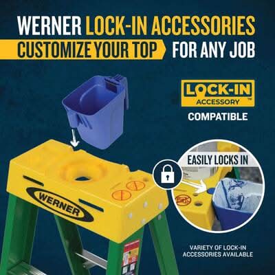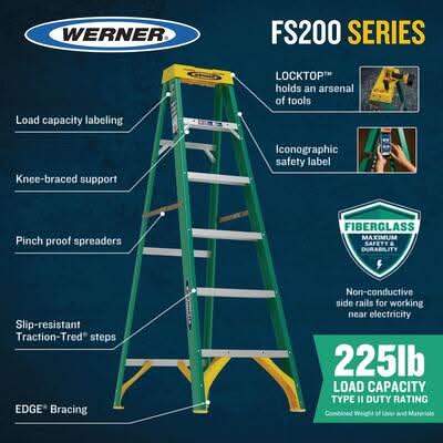 Ideal for both home and jobsite applications, Werner's 6 ft. Fiberglass Step Ladder offers a duty rating of 225 lbs. and a multi-functional HolsterTop to keep tools organized and safe while you work. Its non-conductive fiberglass rails make it a safe choice for working around electricity, while slip-resistant steps ensure secure, comfortable standing. Built with the EDGE bracing system to help prevent rail damage, the ladder works great indoors or out with a 10 ft. reach, perfect for painting projects and repairs. Size: 6'