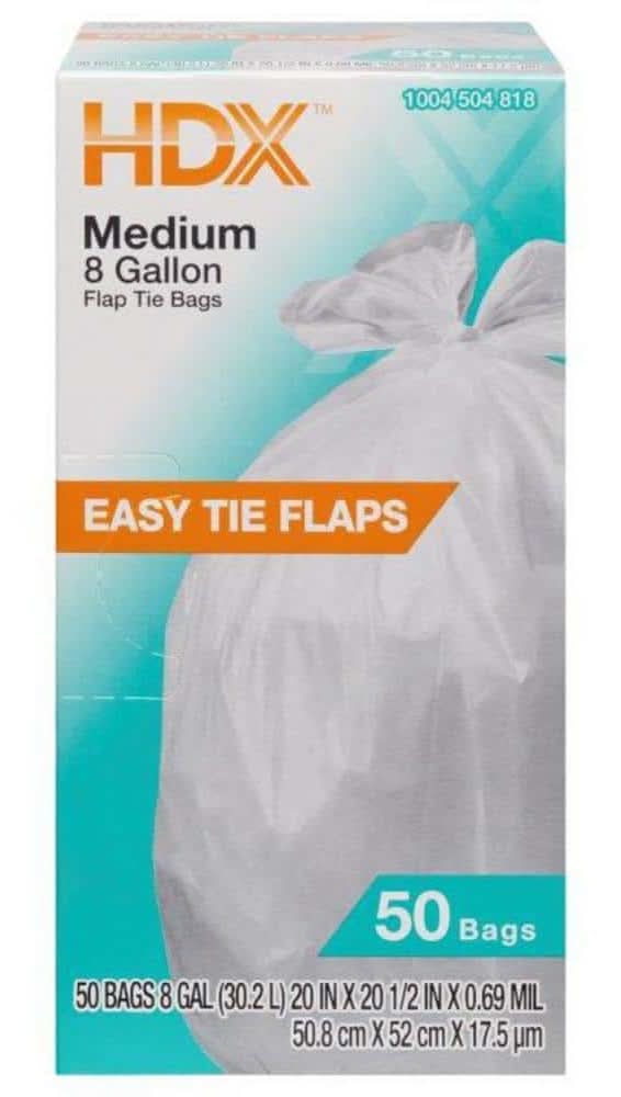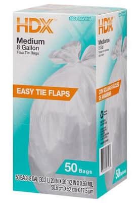 8 Gal. Medium White Trash Bags with Flap Ties 50-Count are perfect for home, bathroom, nursery and office trash cans. Built-in easy tie flaps keep trash inside and disposal neat. Also perfect for special clean up projects around the house. • Color: White • Size: Medium