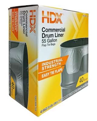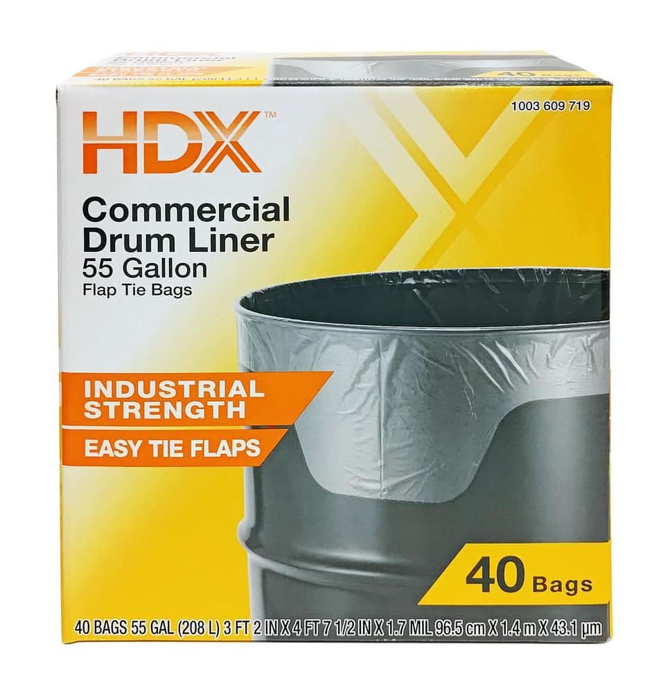 Move your trash and recycling with confidence using the HDX 55 Gal. Heavy-Duty Drum Liners. Manufactured using premium polyethylene resin for strength and durability, these clear bags are 1.7 mil in thickness and boast flap tie closures to keep contents easily contained. 1-by-1 dispensing design provides easy access.