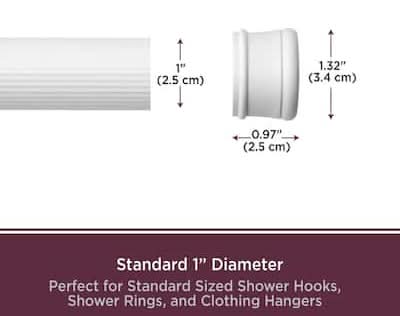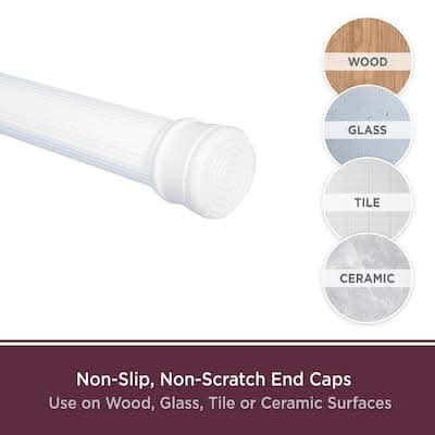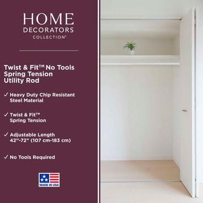 The Home Decorators Spring Tension Utility Rod is easy to install without tools. Use it as a shower curtain rod in standard and oversized bathtubs, or for added storage in closets, laundry rooms, and more. Made of heavy-duty steel, this utility rod is coated with a chip resistant material to prevent rust over time. The non-slip, non-scratch end caps mean no damage to your wall or tile, making this a good solution for rentals or other temporary installments. The end caps include ring locks to keep your shower curtain against the wall, preventing drafts. To install: Extend rod 1-1.5 in. beyond the width of your shower opening, then compress the ends of the rod together and release into place to secure. • Color: White • Size: 42 In - 72 In