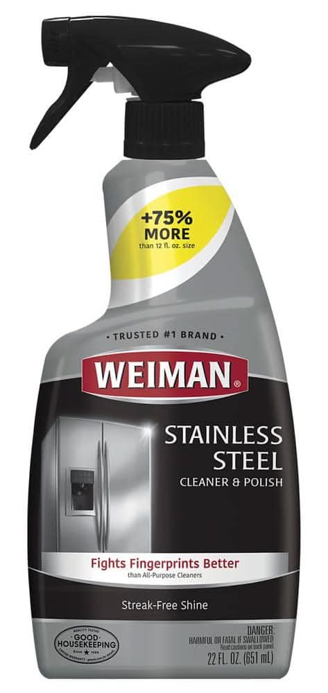 Give your appliances the showroom treatment with the convenient Weiman Stainless Steel Cleaner and Polish. A cleaning spray designed with a polish that protects and resist fingerprints, watermarks and grease, while also repelling dust and dirt to keep your kitchen shining brighter and longer. Your stainless steel fridge, outdoor grill, dishwasher, washing machine, washer and dryer, microwave, cooktop, sink, faucet, and any metal or stainless-steel appliance surface will effortlessly convey a streak free, premium stain resistant and clean look. Weiman Stainless Steel Cleaner and Polish helps restaurants and commercial environments with the highest of expectations to look their very best (surfaces, refrigerator, and appliances). Weiman polishes, resists scratching, and resists staining with just a simple wipe and buff, then you're done. Restore the brilliant look of your kitchen with our line of Weiman specialty cleaning products that compliment your wood floors, cooktops, granite surfaces, silverware and more. Weiman Products is the perfect home, chef, pro, scratch resistant, cleansing, household, professional, and at work solution for all of your stainless steel cleaning and buffing needs. The best specialty cleaning products you will buy online or in a store. When cleaning is your therapy, Weiman is your method, just wipe away and not a fingerprint in site.