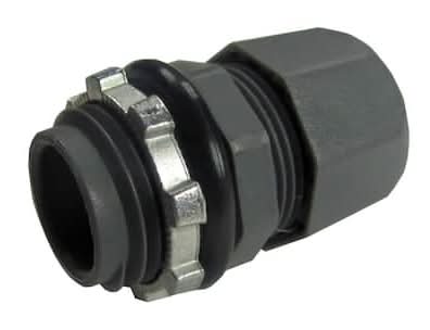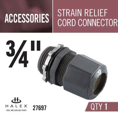 The Halex 3/4 in. ACC Non-Metallic Strain Relief Cord Connector is compatible with galvanized rigid conduit (GRC) and is intended for indoor and outdoor use. This standard-fitting is made of plastic and is UL and CSA safety listed.