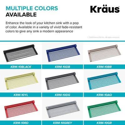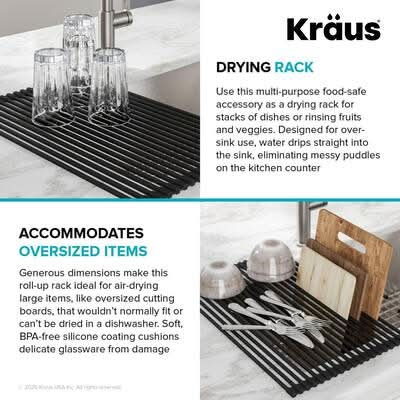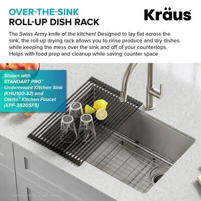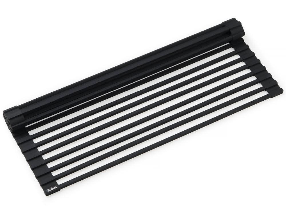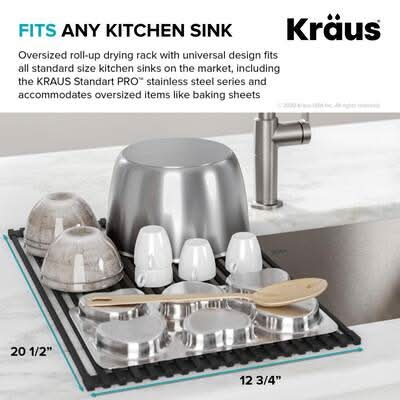 Perhaps the most all-around versatile kitchen accessory, the KRAUS Multi-Purpose Roll-Up Dish Drying Rack is the Swiss Army knife of the kitchen, helping with everything from food prep to clean-up. Designed to lay flat across your sink, this drying rack allows you to wash produce and dry dishes while keeping the watery mess over the sink and off of your kitchen counters. Ideal for rinsing fruits and veggies the convenient over-the-sink design prevents Cancer and Reproductive Harm - www.P65Warnings.ca.gov. Color: Jet black