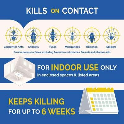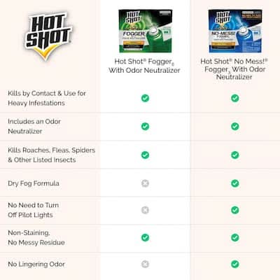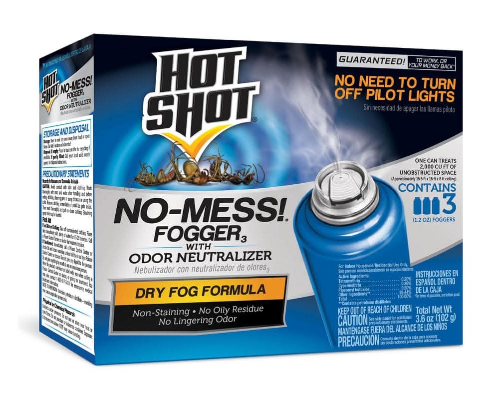 Hot Shot No-Mess Fogger With Odor Neutralizer creates an extremely fine, dry penetrating fog that stays airborne and reaches deep into cracks, crevices and under furniture and appliances to flush out and kill hidden bugs on contact. Kills black carpet beetles, brown dog ticks, carpenter ants, crickets, earwigs, firebrats, fleas, gnats, houseflies, mosquitoes, palmetto bugs, pillbugs, rice weevils, roaches, saw toothed grain beetles, silverfish, small flying moths, spiders and waterbugs. Does not control bed bugs. When used as directed, this odorless, non-staining dry fog will not harm drapes, upholstery, fabrics, carpeting, bedspreads, floor tiles, wood floors, linens, furniture, walls, clothing, ceilings, shades or blinds. Kills both flying and crawling insects on contact and keeps killing for weeks. One can of this product treats up to 2,000 cu. ft. of unobstructed space. Read and follow all label directions before using this product. When creepy bugs attempt to pass, save the day with Hot Shot insecticides.