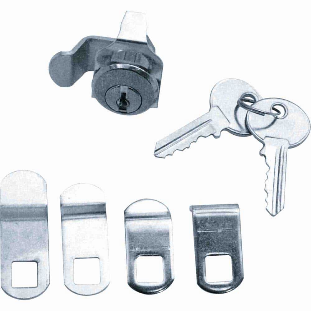 This is a brushed nickel 5-cam mailbox lock that features a die-cast cylinder with a nickel-plated face. This mailbox lock's 5-cam assortment helps replace locks from various manufacturers. It opens with 90-degree, counter-clockwise rotation. Features a diecast cylinder with nickel plated face brass pins and spring steel locking clip. Cams have different bolt throw lengths. All cylinders rotate 90 degrees counter clockwise to open. WARNING: Cancer and Reproductive Harm – www.P65Warnings.ca.gov Size: 7/8 in