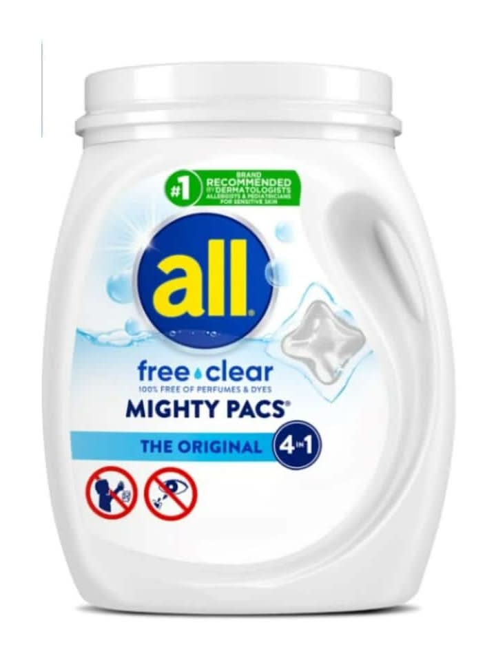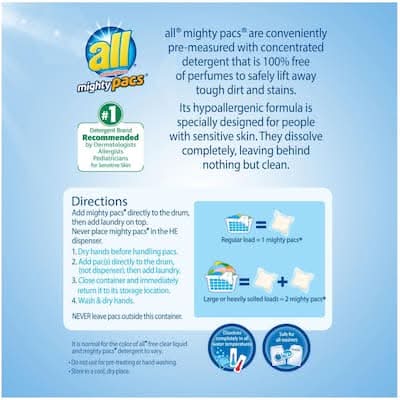 all free clear is the number 1 recommended detergent brand by Dermatologists allergists and Pediatricians for sensitive skin. all free clear mighty pacs give you the perfect amount of detergent every time all with just a flick of your wrist. They're tough on stains, gentle on skin and make no mess at all. • Henkel Corporation, Rocky Hill, CT, 06067 • Packaging: Reusable