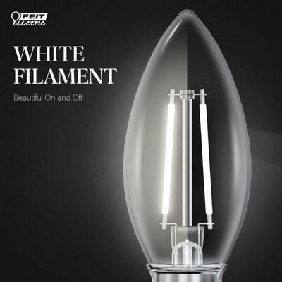 Upgrade your lighting to Feit Electric's elegant CTC100935CAWFILHDRP3 Exposed White Filament LED Light Bulbs for a fresh take on decorative bulbs. These first-of-their-kind white filament bulbs take a traditional torpedo tip bulb with exposed filament encased in clear glass and add lower-profile white filaments. Unlike yellow filaments, these blend into your current decor, for a timeless look that complements any room. They give off a 3500K True White glow ideal for craft rooms, offices, living spaces, and anywhere you desire balanced, neutral light. These dimmable bulbs fit in any E12 Candelabra base such as chandeliers, wall sconces, pendant lights, and more. With a 90+ CRI, these bulbs make colors appear more vivid and true-to-life. The 10-watt White Filament LED light bulb emits 1000 lumens while only using 10 watts of electricity, up to 90% less energy than equivalent 100-watt incandescent bulbs. Get up to 15,000 hours/13.7 years of use (based on 3 hours per day use) with an estimated annual energy cost of only $1.20. Create a stylish feel that instantly enhances any home or commercial space.
