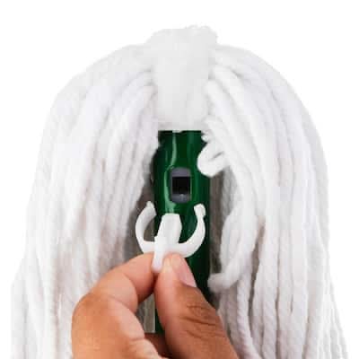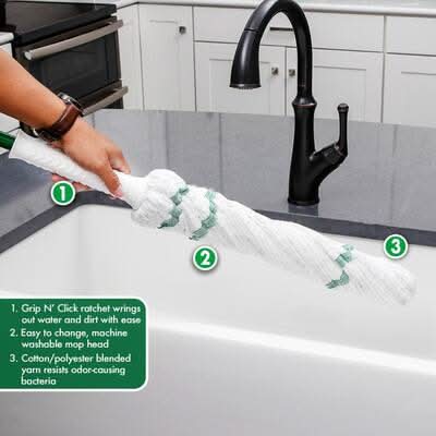 Instructions: 1. soak mop in water before twisting. 2. pull wringer grip back over ratchet, up toward handle grip. 3. twist wringer grip to your left to wring out water. 4. push wringer grip down past ratchet and twist to your right. you are ready to mop! use & care: machine wash warm in mesh bag or hand wash. hang to dry. to replace mop head: 1. separate cotton strands and pull plastic tab (a) out from handle. do not discard plastic tab. 2. pull white connector (b) out of handle. 3. pull mop head with wringer (c) off handle. 4. remove wringer handle (c) from mop head and save. reverse order from above sequence to install mop head.