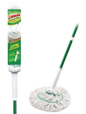 Get superior clean with the Libman Tornado Mop. Boasting a lightweight construction, this easily-maneuvered floor mop features a grip n' click ratchet to wring out more water to avoid drenching your expensive floors. All you need is a bathtub, sink, or utility mop bucket to wring out this mop due to its built-in wringing mechanism. The Libman mop head has three green bands to prevent tangling. You can easily remove the head to wash it in the washing machine between applications. Libman mop refill heads are available, and it is always good to keep some clean mop replacement heads on hand. Works great as a hardwood floor mop, mop for laminate flooring, or on any hard flooring surface. Libman, 220 N. Sheldon Arcola, IL 61910