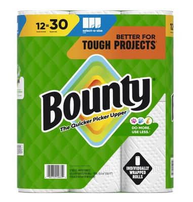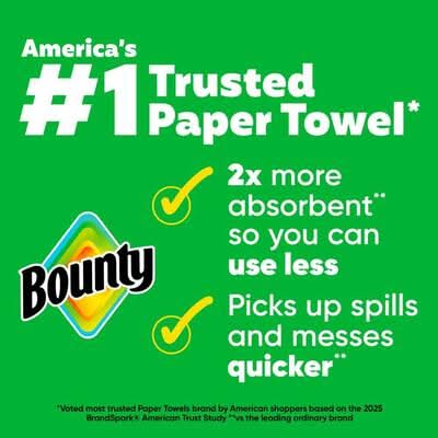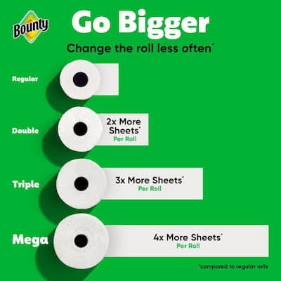 Spilled your drink. Quick. The Quicker Picker Upper. Be ready to tackle messes and spills with Bounty Paper Towels. Each sheet is 2x more absorbent, so you can use less and pick up spills and messes quicker than the leading ordinary brand. That's why Bounty is the Quicker Picker Upper. Bounty Paper Towels are available in 2 sheet sizes, Full Sheet and Select-A-Size, so you can choose which option works best for you. Bounty Select-A-Size towels are versatile, so you can choose your sheet size depending on your mess. and if you're buying the bigger packs, you'll always have Bounty on hand. Bounty has a variety of pack and roll sizes to fit your needs. Bounty products are proudly made with American jobs and we're fully committed to creating solutions for a sustainable future. Across all our products, we consider the impact on people, forests and the world. That's why for every tree we use, at least 2 are regrown so you can conveniently and confidently clean messes in the kitchen and around the house knowing Bounty Paper Towels is helping to keep forests greener. Bounty always has your back in and out of the kitchen so whether it's juice on the counter or ice cream on the table, we make sure spills won't stand a chance. *vs. leading ordinary brand. Size: 11x5.8 in