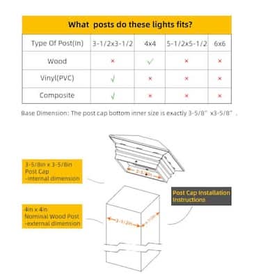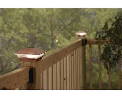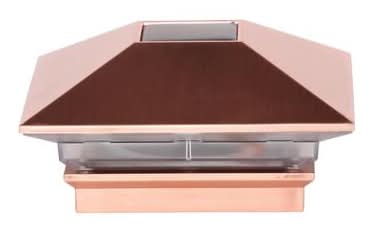 Copper Top off fence posts lining driveways, walkways, and decks with this solar-powered LED post cap. This post cap light provides both ambient and functional lighting keeping your landscape both safe and beautiful. This post cap fits standard 4x4 wood posts and includes all mounting hardware needed for installation. Note that standard 4 in. x 4 in. wood posts actually measure 3.5 in. x 3.5 in. These post caps will not fit a post measuring 4 in. x 4 in.