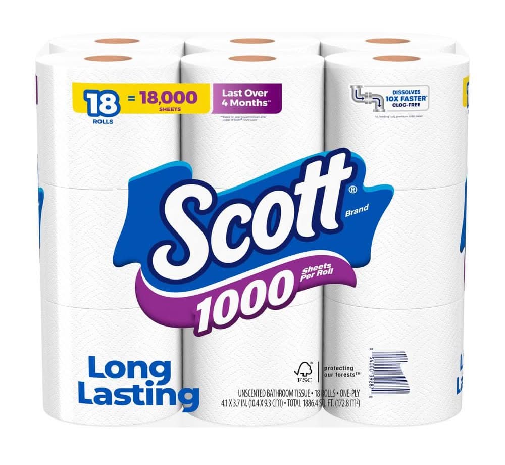 Take care of your family with Scott 1000 bath tissue, America's longest lasting roll, versus national brands' best-selling rolls and enjoy fewer roll changes and more value for your home. Each toilet paper roll contains 1000-sheets. Plus, Scott 1000 1-ply bathroom tissue dissolves quickly, so it's kinder to your plumbing and safe for sewer and septic systems. You can even use it in your RV or boat. • Color: White • Kimberly-clark Global Sales, Llc, Neenah, WI, 54956 • Packaging: Reusable