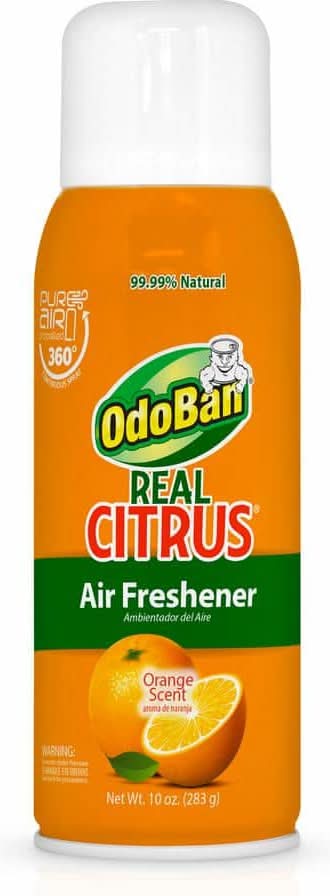 OdoBan Real Citrus Air Freshener contains natural citrus oils to instantly freshen any room in your home. Leaves a natural, fresh, and lasting orange citrus scent you'll love! Keep in your bathroom to use as an in-bowl toilet air freshener. Simply spray into the toilet bowl before use to trap stinky odors under a barrier of natural citrus oils. Made with 99.99% natural ingredients. Use as directed on label.