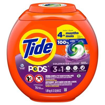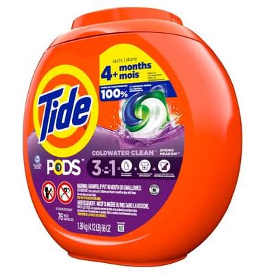 Tide PODS laundry detergent pacs offer surprisingly powerful clean in 1 step. Combining super concentrated detergent, extra odor fighters, and extra stain removers, each capsule cleans, freshens, and rejuvenates clothes for brighter brights and whiter whites.Small yet powerful, Tide PODS deliver cleaning power in a convenient, pre-measured unit dose form. Also, thanks to the special film and HE Turbo technology with quick-collapsing suds, the capsules dissolve completely in all temperatures and do not produce excess suds.The Spring Meadow scent is infused with with fresh floral notes to help keep your clothes smelling great. More than just a liquid in a pouch, Tide PODS delivers a surprisingly powerful clean in 1 step. Packaging: Reusable