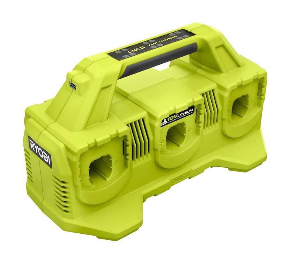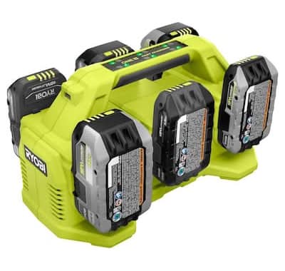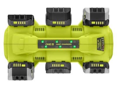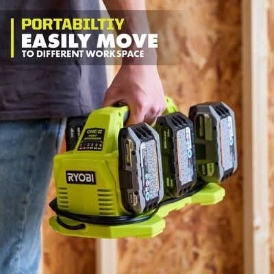 Expand your RYOBI 18V ONE+ System with the RYOBI 18V ONE+ 6-Port Fast Charger. With 30% faster charging than P135, this charger decreases downtime significantly. Made with convenience in mind, it can consecutively charge and maintain up to 6 18V ONE+ batteries. This charger includes a 2 Amp USB output allowing users to charge portable electronics. Featuring LED indicator lights, users can easily identify battery charge status. The Energy Save Mode conse Cancer and Reproductive Harm - www.p65warnings.ca.gov