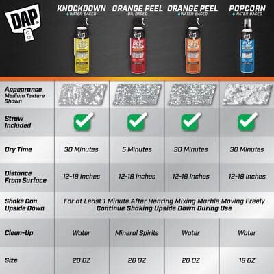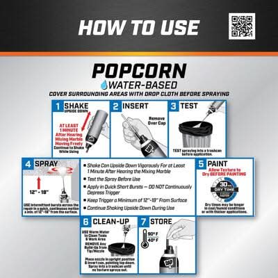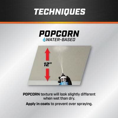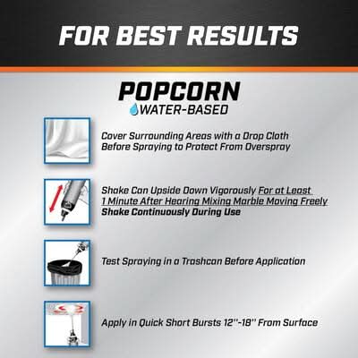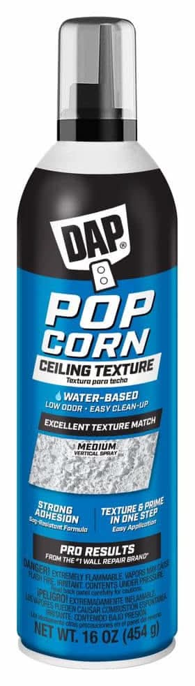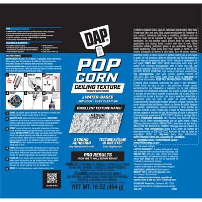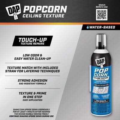DAP Ceiling Spray Texture Popcorn Water Based is an easy to use aerosol for targeted ceiling repairs that provides excellent texture match with included straw, circular patterns and different stroke motions. Apply texture in overlapping patterns to avoid gaps or uneven spots in finish. Quick repair spray texture in a white finish and a non sag formula has strong ceiling adhesion. Product does not require priming or painting. Fast dry time of 30- WARNING Cancer and Reproductive Harm - www.P65warnings.ca.gov