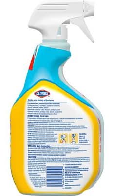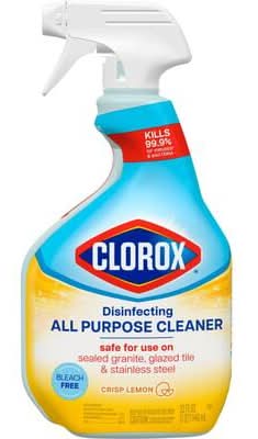 Tackle everyday messes with Clorox Disinfecting All Purpose Cleaner that cuts through tough grease and grime on a variety of surfaces. Safe to use on multiple hard, nonporous surfaces like kitchen sinks, counters, refrigerators, appliances, tubs, toilets, fiberglass, floors, showers and tile, this disinfecting spray leaves behind a Crisp Lemon scent without the odor of bleach for a sparkling clean experience in your home. It even kills 99.9% of bacteria and viruses* and stops bacteria** growth for 24 hours on nonfood contact surfaces. Just see what Clorox Disinfecting All Purpose Cleaner can handle: dirt, fingerprints, food, oily spills, greasy spatters, messes, food stains, grime, outdoor grime, smudges, soap scum, sticky food and tough soils. Enjoy confidence in a long lasting clean with Clorox Disinfecting All Purpose Cleaner. *When used as directed on hard nonporous surfaces. **Odor causing bacteria. Allow product to air dry. • The Clorox Company, 1221 Broadway-Oakland-CA-94612 • Packaging: Reusable