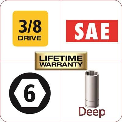 Each of the Husky 3/8 in. drive sockets feature chamfered lead-ins for quick and easy placement onto fasteners. They are made strong with chrome alloy steel and heat treated to protect them over the lifetime of hard use they will endure. Their polished chrome finish resists rust and corrosion and easily wipes clean of oil and dirt.