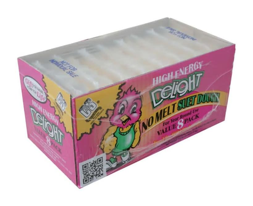 This Wild bird food is a-packaged Value 8-pack of High Energy Delight Suet Dough. A Top Selling No Melt, No Waste, No Mess, suet cake with a peanut base for excellent wild bird attraction. For feeding wild birds all-year round.