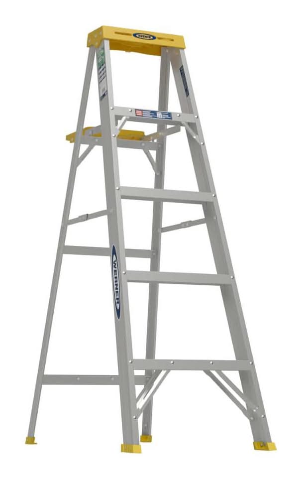 Make DIY jobs easier with this Werner 5-ft. step ladder. Rated to hold up to 225 lbs., this step ladder provides five, slip-resistant Traction-Tred steps with a 9-ft. reach. For more stability, it comes with bottom and top step braces. Pinch-Proof spreaders make this ladder easy to open and close. The high-performance HolsterTop holds your tools and paint, and aluminum construction makes it built to last. Size: 5 ft