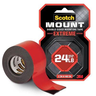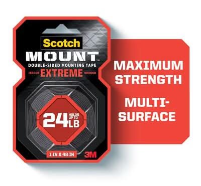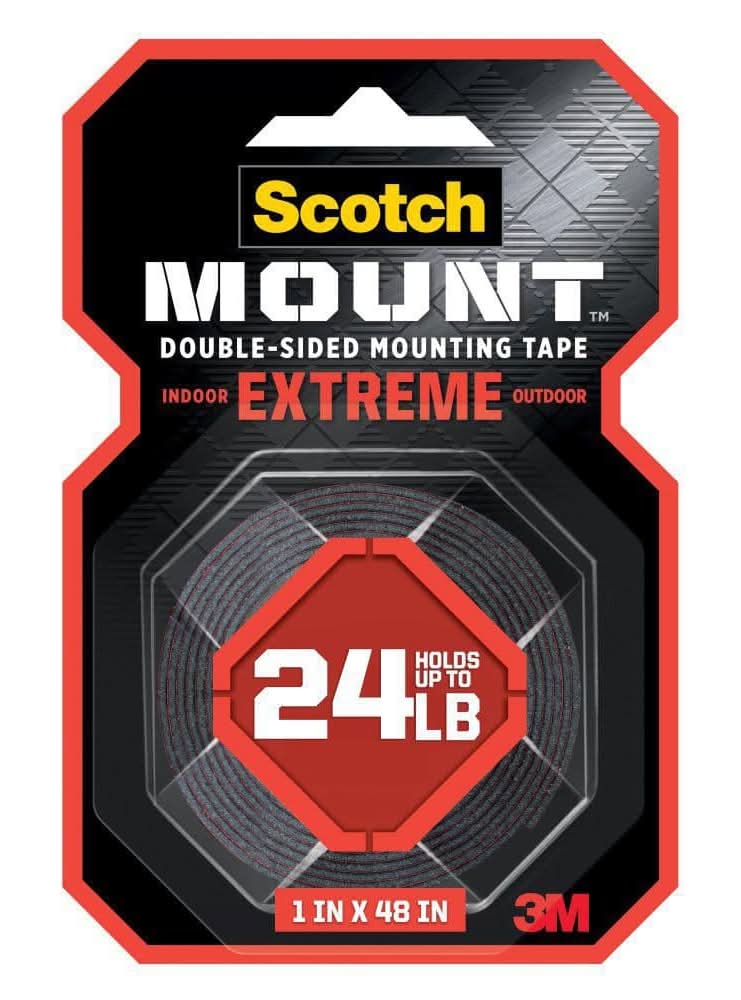 For your toughest jobs, go for our strongest hold–Scotch-Mount™ Extreme Double-Sided Mounting Tape with its 3M™ industrial strength adhesive. Equipped with our powerful permanent adhesive, this double-sided tape defies gravity, holding an item up to 24 pounds. It's weather resistant for a long lasting bond, indoors and outdoors. So whether you’re mounting artwork in your new apartment, or adding wall organization to the garage, Scotch-Mount™ Extreme Double-Sided Mounting Tape does the job quickly, easily and without the hassle of tools. • Color: Black • Size: 1"x48''