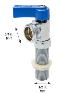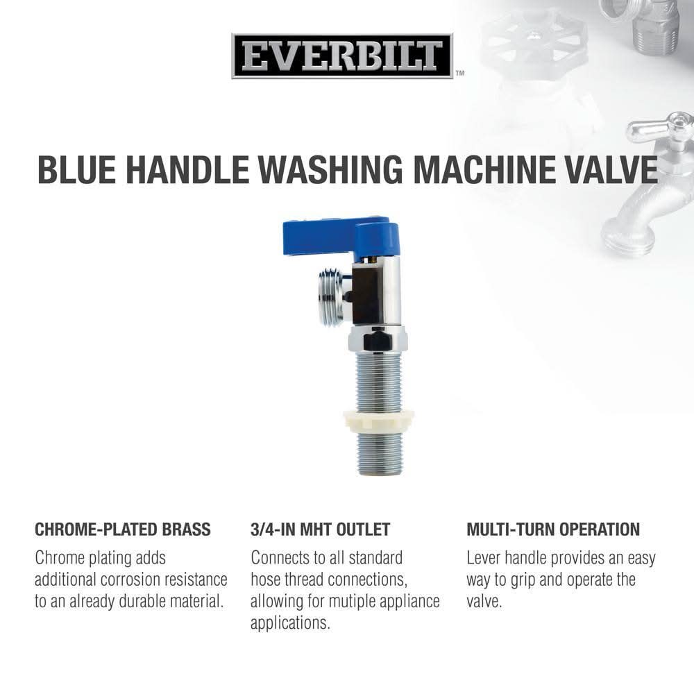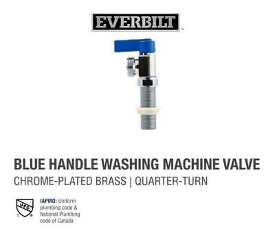 This Washing Machine Valve by Everbilt offers a secure way to hook up your appliance to your water supply. This valve comes with a blue handle to indicate the inlet is your cold water supply. The ball valve design ensures easy to use operation even after long periods of not being operated. Cancer and Reproductive Harm - www.P65warnings.ca.gov Size: 1/2x3/4 in