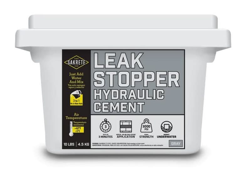 The SAKRETE 10 lb. Leak Stopper Cement is designed to stop the flow of water through breaks in concrete or masonry walls and floors. This fast-setting hydraulic cement sets in approximately 1-3 minutes and has compression strength of 3,000 psi. Can be used for both interior and exterior applications.