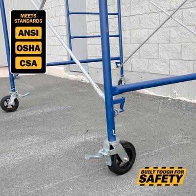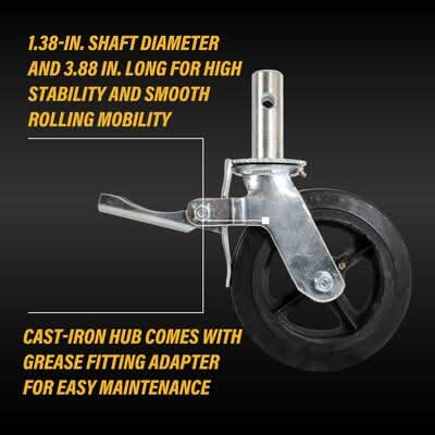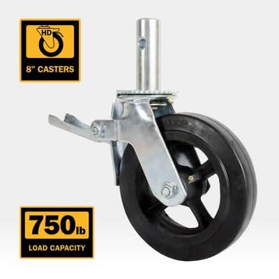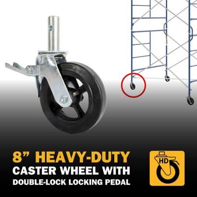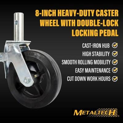 Our 8-inch Heavy Duty Caster Wheel with Double-Locking mechanism and lockpins is a sturdy, safe, and reliable scaffolding caster. Designed to be used on scaffolding frames or outriggers these allows the user to move their scaffolding around the job inside and outside. The heavy-duty casters are also usable on most other standard scaffolding frames. They're built from industrial-strength rubber and mounted on cast-iron hubs with grease-fitting adapters for easy maintenance. Each wheel can support a total weight of 750 pounds and is built primarily for use on concrete floors.These 8-inch rubber caster wheels can help significantly reduce job task completion hours thanks to their stability and smooth mobility, letting you move your scaffolding tower to new locations to continue the work.The casters can be especially helpful on larger scaffolds where they need to bear the weight of two or three levels' worth of scaffolding equipment, tools, and materials. The double-lock mechanism on the wheel helps increase the stability of the platform scaffolding and adds a layer of safety to the work. All Metaltech scaffolding wheels meet OSHA standards of safety.Metaltech builds and designs practical, effective, efficient, and safe work equipment for office and home use. We strive to incorporate new technology and innovation into equipment and accessories that make sense, so you can get jobs done easily, safely, and on time.