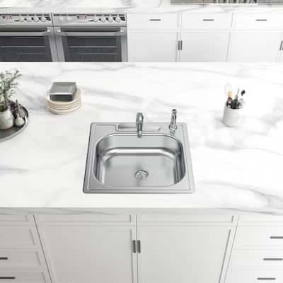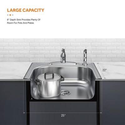 Top mount 25 in. x 22 in. x 8 in. single bowl kitchen sink features thick and durable stainless steel with a long-lasting satin finish for added style to enhance your kitchen. The generous single bowl offers plenty of room to make food preparation and clean-up easier, while a sound deadening pad reduces noise for a quieter kitchen. Faucet holes are already pre-drilled in the faucet deck and for added convenience, a faucet comes ready to install.