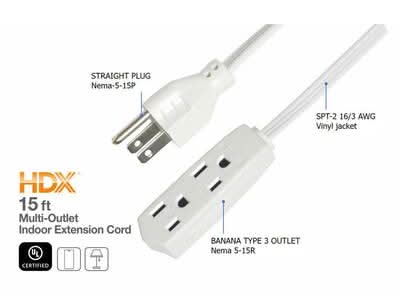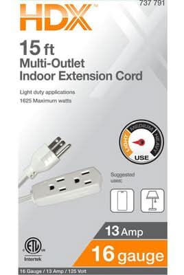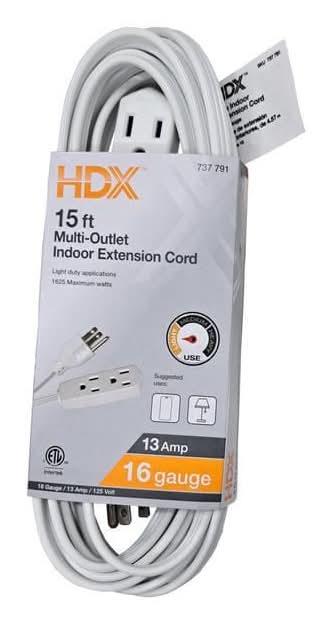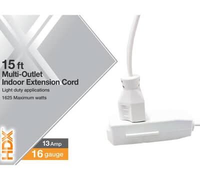 This HDX 15 ft. 16/3 Indoor Multi-Outlet Extension Cord is great for indoor use in a home office or other living space. The long extension cord is convenient for providing power to indoor holiday lights and small appliances. It is designed with 3 grounded outlets and a molded-on 3-prong banana plug. This product can expose use to chemicals including lead which is known to the State of California to cause cancer and birth defects or other reproductive harm. For more information go to www.P65warnings.ca.gov. • Color: White • Size: 15 ft