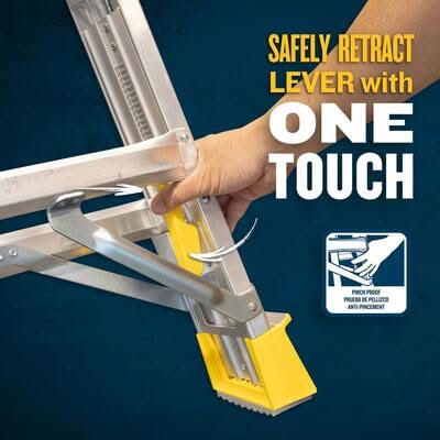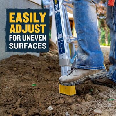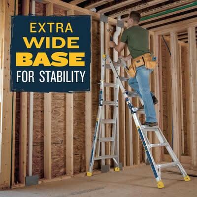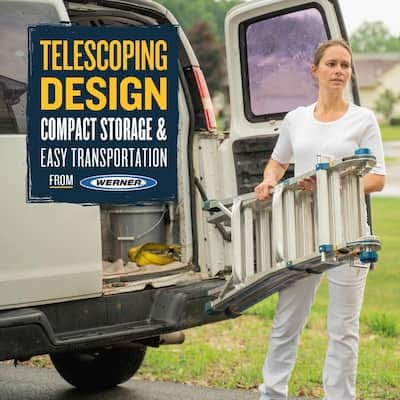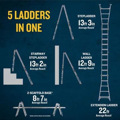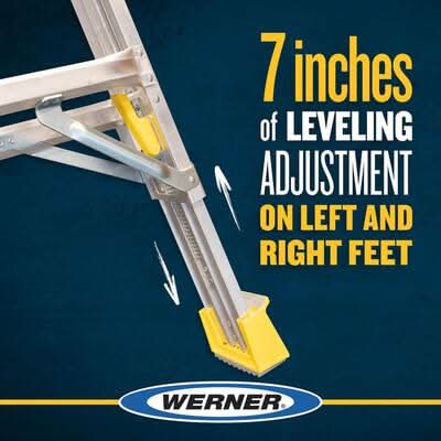 Werner's lightest weight 375 lbs. Multi-Position ladder, NOW includes Built-In Leveling. 2-ladder feet easily adjust with up to 7 in. of leveling capability. This 5-in-1 multi ladder adjusts to 32-positions, allowing you to do more jobs quickly and safely. Quickly adjust to use as an extension ladder, double-sided twin 2-person step ladder, stairway ladder, 90° wall ladder or as 2-self-supported scaffolding bases. The redesigned shatterproof aluminum j-locks are easy to use. Oversized impact resistant push knobs are more comfortable, and protect your ladder from damage. With its many uses, the new Multi-Position Pro with Leveling will fit all your climbing needs.