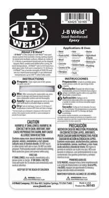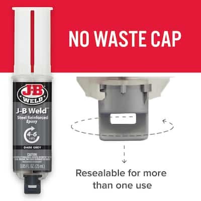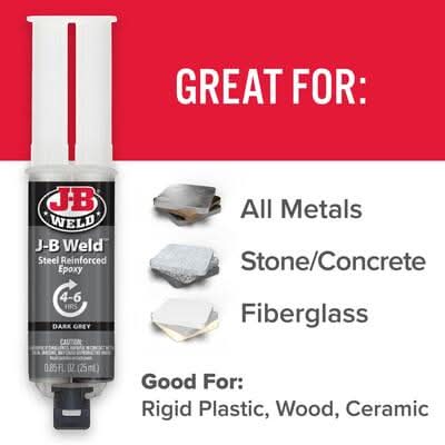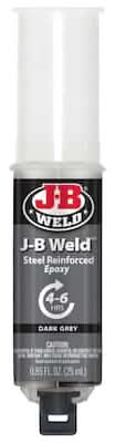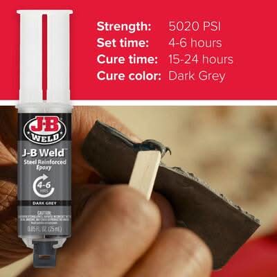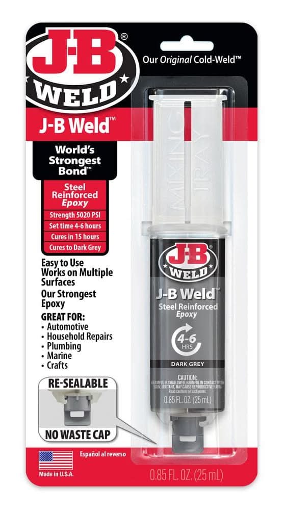J-B Weld is The Original Cold-Weld 2-part epoxy system that provides strong, lasting repairs to metal and multiple surfaces. Mixed at a ratio of 1:1, it forms a permanent bond and can be shaped, tapped, filed, sanded and drilled after curing. At room temperature, J-B Weld sets in 4-6 hours to a dark grey color. Full cure is reached This product contains a chemical known to the State of California to cause cancer, birth defects or other reproductive harm. For more information, go to www.P65Warnings.ca.gov. Color: Dark grey