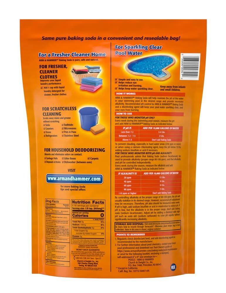 For a fresher cleaner homearm & hammer baking soda is pure, safe and natural.for fresher, cleaner clothesimproves your liquid laundry performance.☑ add 1 cup with liquid laundry detergent for cleaner, fresher clothes.for scratchless cleaningscrubs away stains and grease without scratching.☑ sink☑ counters☑ ovens☑ refrigerators☑ bathtubs☑ microwaves☑ pots & pans☑ stainless steelfor household deodorizingabsorbs and eliminates odors on contact.☑ garbage pails☑ disposals & drains☑ litter boxes☑ dishwasher (between uses)☑ carpetsfor sparkling clear pool water☑ simple and easy to use.☑ helps reduce eye irritation and burning.☑ helps keep water sparkling clear.