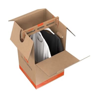 The Heavy Duty Tall Wardrobe Moving Box includes a Heavy Duty Bar with 8 layers of board, providing a high weight support capacity. It features hand holes for easy carrying and helps you move or store hanging clothes. This wardrobe box is made from 100% recycled materials.