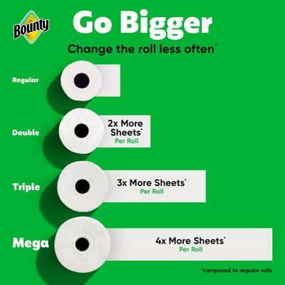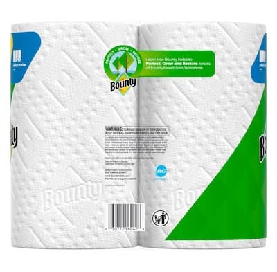 Spilled your drink. Quick. The Quicker Picker Upper. Be ready to tackle messes and spills with Bounty Paper Towels. Each sheet is 2x more absorbent, so you can use less and pick up spills and messes quicker than the leading ordinary brand. That's why Bounty is the Quicker Picker Upper. Bounty Paper Towels are available in 2-sheet sizes, Full Sheet and Select-A-Size, so you can choose which option works best for you. Bounty Select-A-Size towels are versatile, so you can choose your sheet size depending on your mess. and if you're buying the bigger packs, you'll always have Bounty on hand. Bounty has a variety of pack and roll sizes to fit your needs. Bounty products are jobs and we're fully committed to creating solutions for a sustainable future. Across all our products, we consider the impact on people, forests and the world. That's why for every tree we use, at least 2 are regrown so you can conveniently and confidently clean messes in the kitchen and around the house knowing Bounty Paper Towels is helping to keep forests greener. Bounty always has your back in and out of the kitchen so whether it's juice on the counter or ice cream on the table, we make sure spills won't stand a chance. verses leading ordinary brand. • Color: White • Size: 11x5.9 in