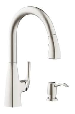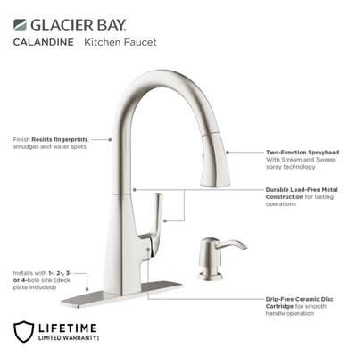Give your kitchen an updated look with a softened look to a contemporary style with smooth, sculpted edges. The Calendine single handle Pulldown Kitchen Faucet, complete with soap dispenser. The flexibility of the pull down operation is enhanced by a dual-function sprayer on a swivel connection that makes reaching any corner of your sink in 1 fluid motion. Even installation is fast and easy with the exclusive Glacier Bay FastMount system.