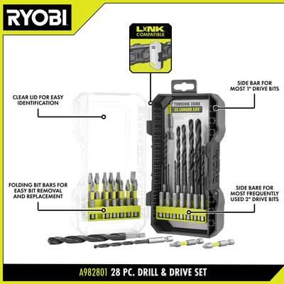 Complement your drilling and driving solutions with the RYOBI 28 PC. Drill and Drive Set. This assortment of drilling and impact bits are ideal for a variety of projects. The Black Oxide bits are constructed out of high-speed steel with a black oxide finish. These drill bits can be used on wood, metal, and plastic materials. Another key detail of these bits, is the 135° split point that prevents your bit from walking and ensures drilling on contact. Th Cancer and Reproductive Harm - www.p65warnings.ca.gov Color: Black-silver