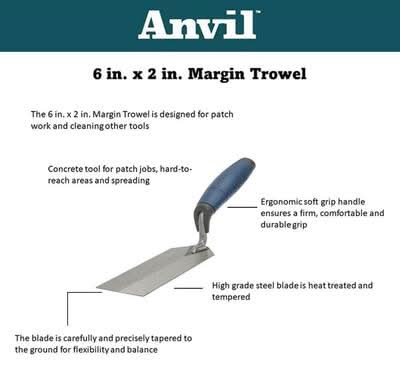 The 6 in. x 2 in. Margin Trowel is designed for patch work and cleaning other tools. The strong, two piece welded blade is made of high carbon, heat treated and tempered steel. The blade is carefully and precisely tapered to the ground for flexibility and balance. The ergonomic pro soft grip handle ensures a firm, comfortable and durable grip. Size: 6 In. X 2 In