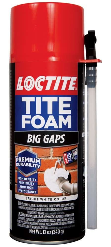 Loctite TITE FOAM Big Gaps is a new generation of polyurethane-based insulating foam sealant that expands to fill, seal and effectively insulate gaps and cracks up to 3 in. in size, inside and out. Loctite TITE FOAM Big Gaps is a bright white color and offers premium durability with its high density, flexibility, strong adhesion and UV resistance. Use to seal out air, moisture and pests in basements or crawlspaces, attic hatches and plumbing, HVAC or electrical penetrations. Quick and convenient to use and apply TITE FOAM Big Gaps offers an easy insulating spray foam option. It is recommended for use in both interior and exterior environments and is sandable and paintable. Color: Bright white
