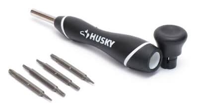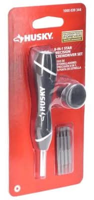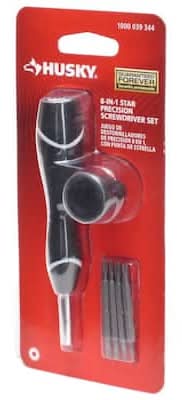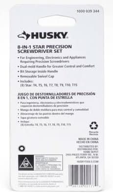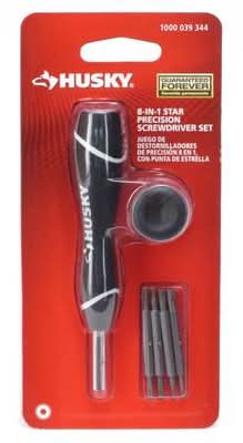 The Husky 8-in-1 Torx Screwdriver Set includes a screwdriver, spinning removable cap for bit storage and 4 double-sided bits with T4, T5, T6, T7, T8, T9, T10 and T15 Torx hex tip sizes. The S2 steel bits are precision-formed to provide superb engagement with fasteners, resulting in no stripping or slippage. These handy tools are ideal for use in work on electronics and in other tasks involving small parts.